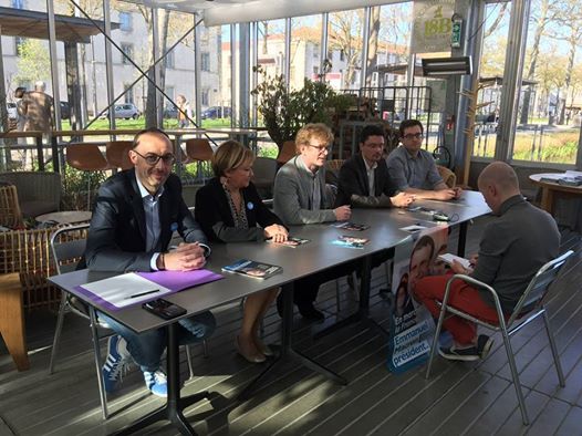 Le vendredi 7 avril, au 18 B à La Roche sur Yon, le MoDem Vendée a eu le plaisir de recevoir Marc Fesneau, secrétaire général du Mouvement. Un café citoyen a permis d'échanger sur le programme d'Emmanuel Macron et sur l'alliance Modem - En Marche. Un objectif : la victoire des progressistes lors de l'élection présidentielle. En préambule, une conférénce de presse a réuni Marc Fesneau, Stephane Buchou (référent départemental d'En Marche), Philippe Barré, Patricia Gallerneau et Maximilien Schnel.
