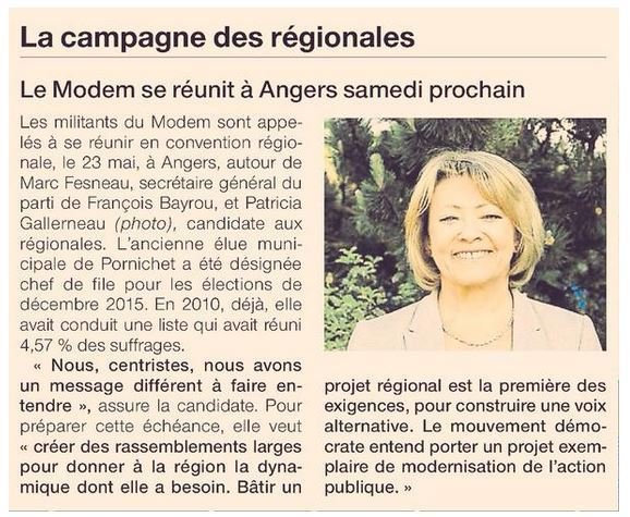 Les militants du MoDem sont appelés à se réunir en convention régionale, le 23 mai, à Angers, autour de Marc Fesneau, secrétaire général du parti de François Bayrou, et Patricia Gallerneau (photo), candidate aux régionales. L'ancienne élue municipale de Pornichet a été désignée chef de file pour les éléctions de décembre 2015. En 2010, déjà, elle avait conduit une liste qui avait réuni 4,57 % des suffrages.